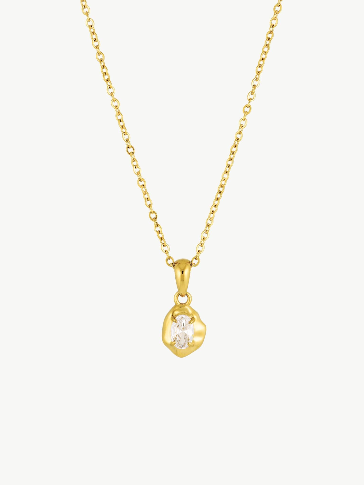 The Zirconia Petite Necklace is a clean and minimal everyday necklace with just the perfect touch of detail. Designed with a delicate chain, it features a small textured pendant with a slight brushed gold texture, and is finished with a white cubic zirconia stone in the middle. It catches the light beautifully for a refined, effortless glow.